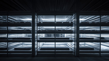 Explore a modern warehouse interior featuring illuminated shelves and a sleek minimalistic design, ideal for showcasing advanced storage solutions and innovative architecture.
