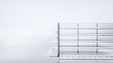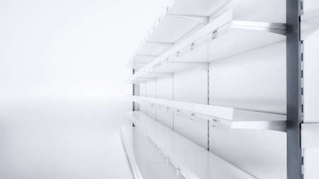 3D image from the side of grocery empty Front/End shelves staying in a row on blank white background. Good for supermarket's mockup.