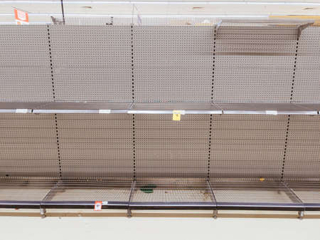 Large empty peg board and row of shelves at grocery stores, food shortage, pandemic, economic crisis or store closing in Dallas, Texas, USA. Clear sold-out goods groceries at retailer super market