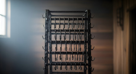 A dark, atmospheric shot of an old, black metal rack with multiple rows of empty, sharp hooks. The room is filled with haze or steam, with a window providing dim light, suggesting a smokehouse, butcher shop, or industrial kitchen.