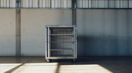 a photo of a cage of cages in an isolated warehouse, featuring minimalistic canine sculptures. the meticulous photorealistic still lifes, inspired by agnes martin, capture the chrome-plated, photorealistic urban scenes. the soft light adds to the urban grittiness of the composition. ai generated