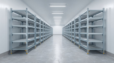 Explore a modern warehouse interior featuring illuminated shelves and a sleek minimalistic design, ideal for showcasing advanced storage solutions and innovative architecture.
