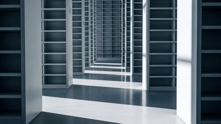 A striking architectural photograph showcasing a seemingly endless corridor lined with empty bookshelves. The perspective creates a strong sense of depth, enhanced by the play of light and shadow.