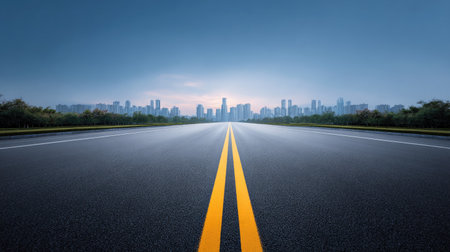 Asphalt road features a striking yellow line leading to a stunning city skyline at sunset, highlighting urban textures and the serene ambiance of the scene
