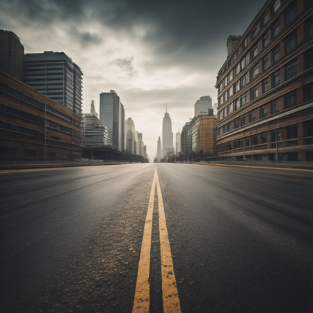 AI Generated. Desolate road through abandoned cityscape under dark clouds