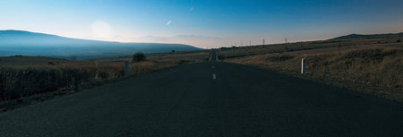 Panoramic view of the empty highway through the fields and forest in a fog at sunrise. Europe. Transportation, logistics, travel, road trip, freedom, driving. Rural scene