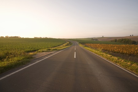 A winding asphalt road stretches through countryside fields under a misty horizon at sunrise inviting exploration and adventure.