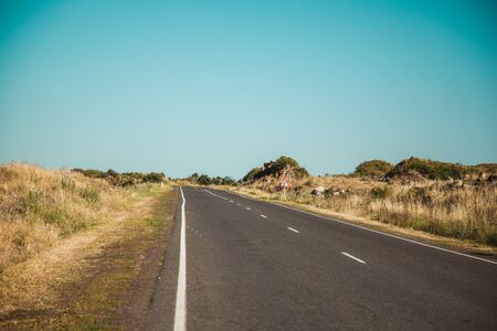 Empty Road With Yellow Line, Abandoned Path Under Clear Skies Leading to Nowhere