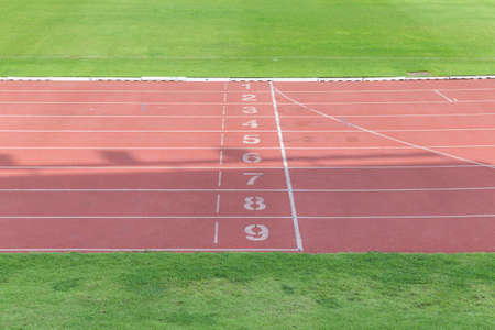 Red runninng race track with lanes at autumn park, Treadmill at stadium, Sport and fitness concept