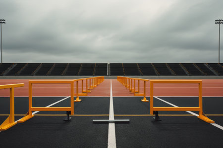 hurdles set up symmetrically on an empty race track, created with generative ai