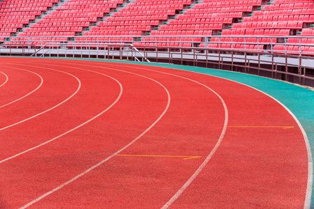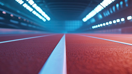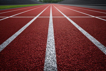 Close-up of a running track in a stadium with white striped markings. Generative AI