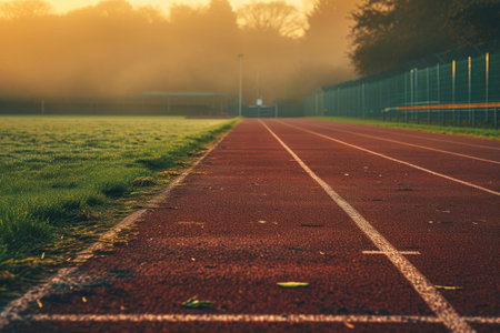 Empty running track at a sports field during early morning with soft sunlight illuminating the landscape