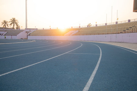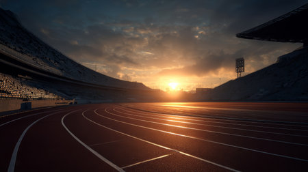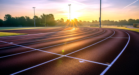 The serene athletics stadium at sunrise, empty yet full of energy, symbolizes determination, focus, and the pursuit of fitness and wellness