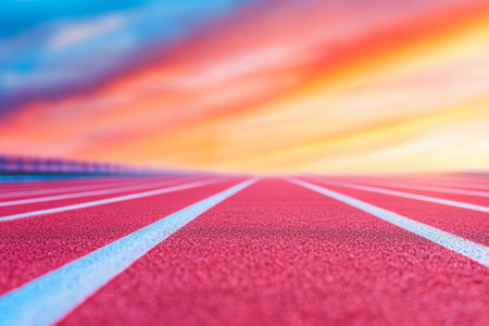 Vibrant Running Track at Sunset with Colorful Sky and Perspective Lines.