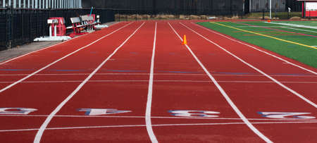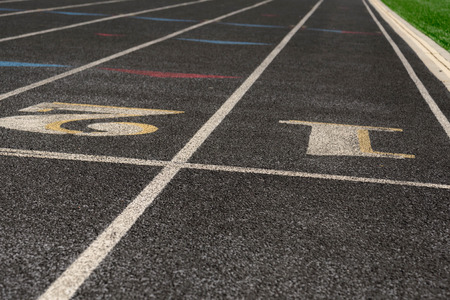 A starting line of brown rubber running tracks with number 1 and 2 painted in a school tracking field during afternoon time ready for athletics to practice.