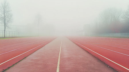 A foggy morning scene of a running track, with lanes disappearing into the mist.