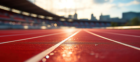 A close-up view of a track lane in a stadium, highlighting the red surface and white line under morning sunlight. The empty stands create a serene backdrop.