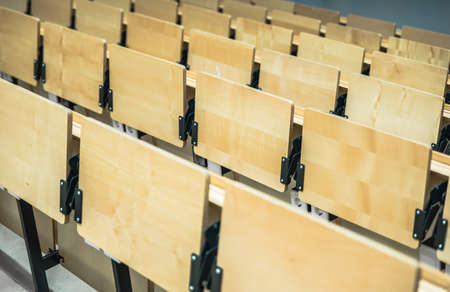 Empty collapsible wooden chairs in auditorium background. Higher education at university or college.