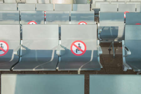 airport seats with distance covid sign