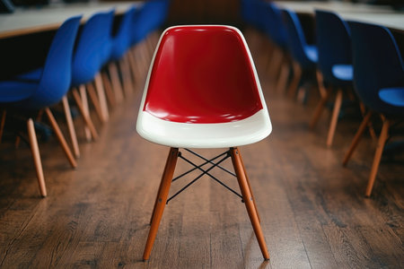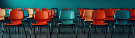 Conference room with plastic chairs detail and yellow floor. Horizontal