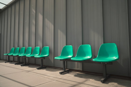 Row of Green Plastic Chairs in Empty Waiting Area with Metal Wall