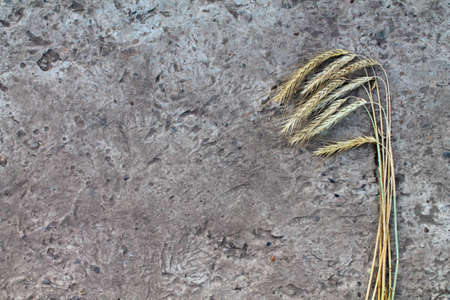 Ears of wheat on a gray concrete background. Flat lay, copy space
