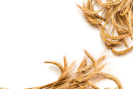 Wheat on a white background close-up mock up. Wheat harvesting season, harvest festival. Copy space.