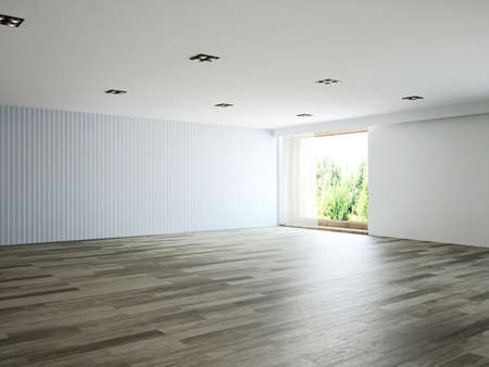 White empty room with wooden floor, 3d rendering. Computer digital drawing.