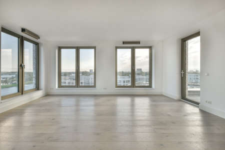 Spacious empty bright room with a parquet floor and large windows in a modern house