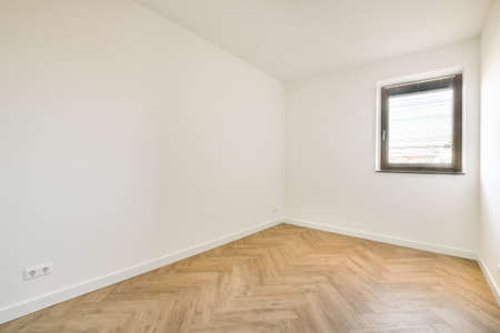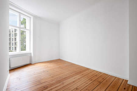 white room in empty flat with window and wooden floor