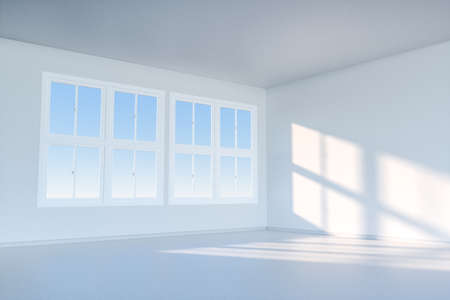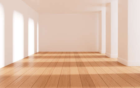 3D rendering of white empty room with wooden floor and sun light cast shadow on the wall. Windows and nature background.