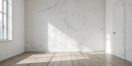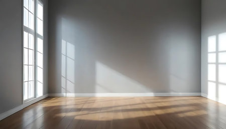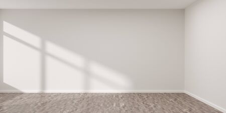 Empty white room with blank walls with shadow from window and brown hardwood floor - presentation or gallery architecture background element, 3D illustration