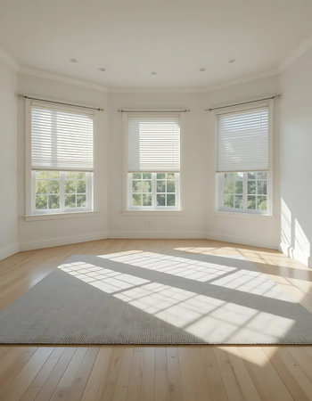Bright empty room with large windows filling space with natural light Ideal for events or gatherings.