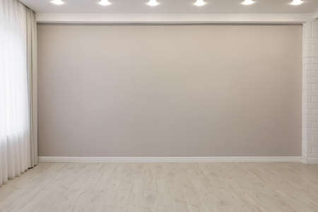 Empty room with beige wall, large window and wooden floor