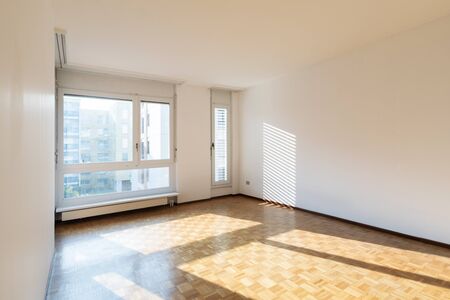 Interior of empty apartment, room with window, wooden floor