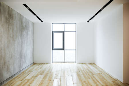 Empty room with white walls, wooden floor and window. 3d rendering