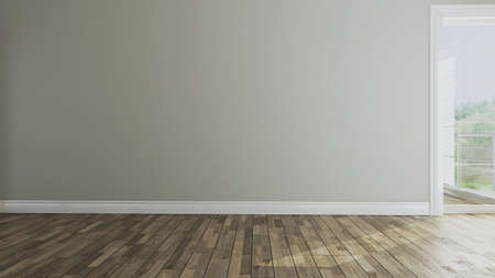 Empty room with balcony door and wooden parquet floor concept 3d rendering