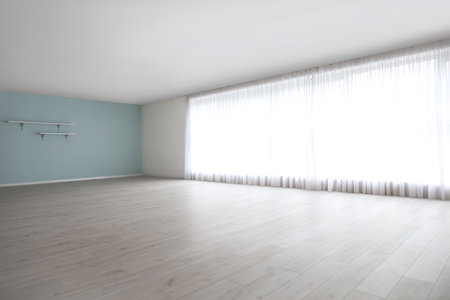 Large, empty room with a white wall and wooden floors. The room is large and open, with a window on the wall. The room is empty and has a clean, minimalist look