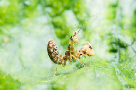 Mantis sitting close-up siting on the green leaf