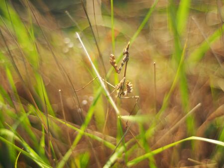 A nymph of european mantis (Mantis religiosa) on a grass in a natural habitat. A nymph of a mantis, male animal. Golden hour, sunset on background.