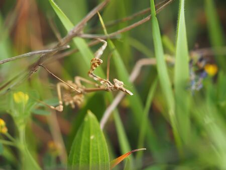 Macro photography, Beautiful European mantis ( Mantis religiosa ) mimicry on vegetation wait for a prey