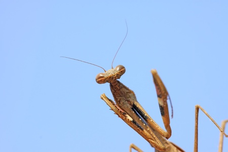 a mantis, its paws have colored stripes, under the blue sky