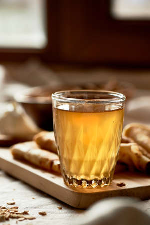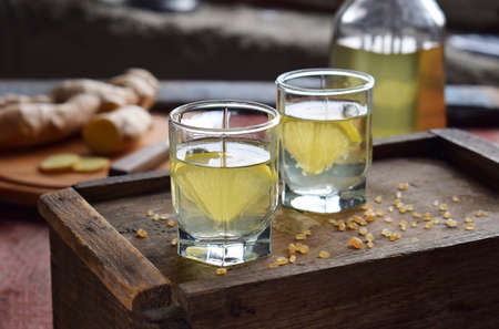 Homemade ginger tincture or ale on wooden background. Rustic style. Spice yellow liqueur in a glass. Alcohol drink