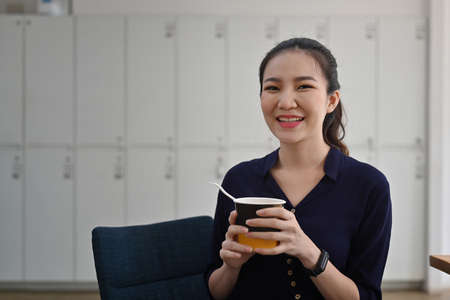 Cheerful asian woman holding cup of instant noodle and smiling to camera.