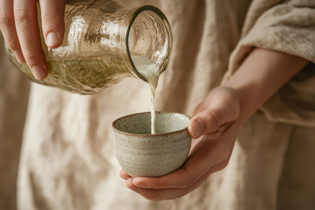 A person pours fresh probiotic-rich kefir from a glass jar into a small handmade ceramic cup. A minimalist and rustic setting emphasizing traditional fermented milk drinks for gut health.
