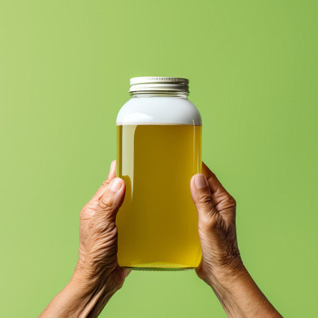 an elderly hand carefully grasps a glass bottle of kombucha, adorned with a blank white label, set against a serene green background, showcasing a high-detailed, ready-made mockup perfect for branding and packaging design, health food, and beverage marketing projects. ai generated