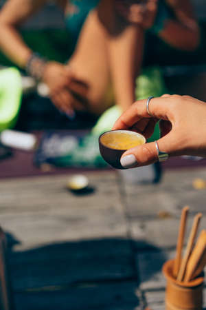 Tea ceremony with smoking incense. Incense stick and tea ceremony.