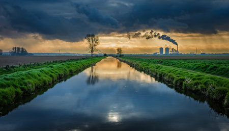A tranquil canal reflects a power plant emitting smoke under a dramatic, cloudy sky, juxtaposing nature and industry in a serene yet thought-provoking landscape.