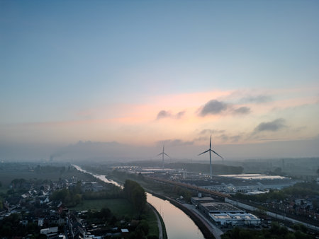 Lot, Beersel, Vlaams-Brabant, 22nd of April, 2025, Breathtaking view of wind turbines, serene waterways, and stunning nature at dawn, showcasing sustainability