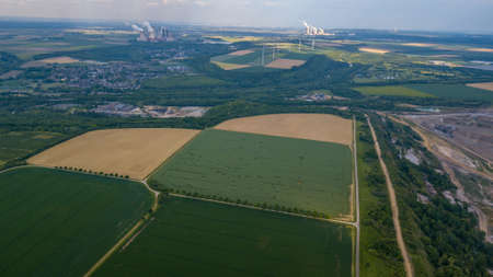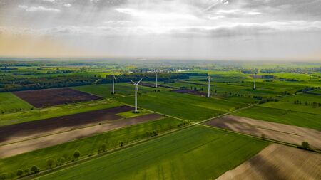 Aerial view of agricultural fields in Germany, green landscape, windmills, alternative energy, wind power. High angle view.